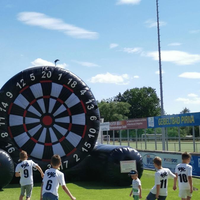 Präzision im Riesenformat. Mit Klett-Fußbällen wird auf eine gigantische, fast 5 Meter hohe Dartscheibe gezielt. Ein Modul, das wirklich jede Altersklasse herausfordert.